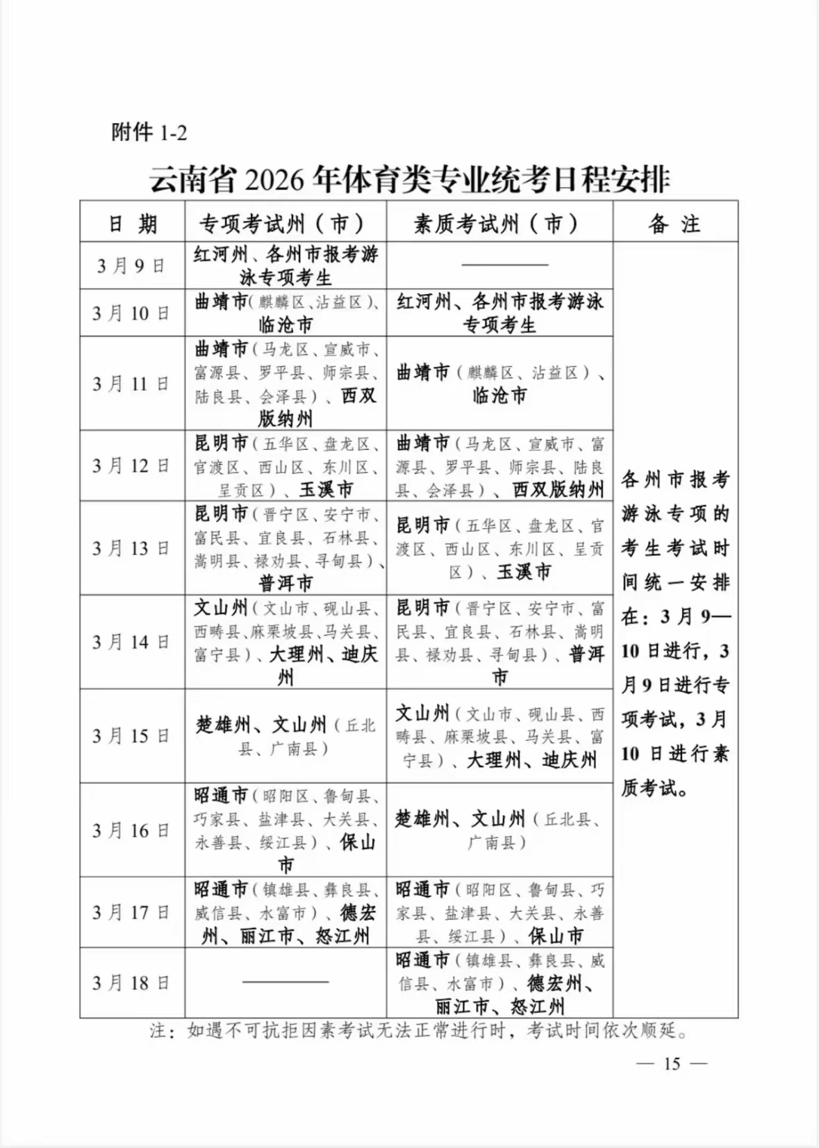 报考云南省体育统考的考生均须参加云南省2026年普通高等学校招生全国统一考试报名,报名、缴费工作及有关要求按照《云南省招生考试委员会办公室关于做好云南省2026年普通高校招生考试报名工作的通知》(云招考委办〔2025〕9号)执行。